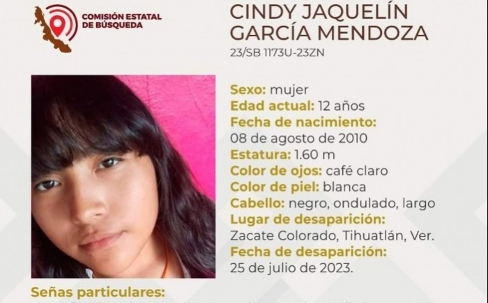 La ficha 23/SB 1173U-23ZN reporta la desaparición de Cindy Jaquelín García Mendoza, de 12 años de edad, con quien se perdió contacto el pasado 25 de julio de 2023 en Zacate Colorado, Tihuatlán, Veracruz.