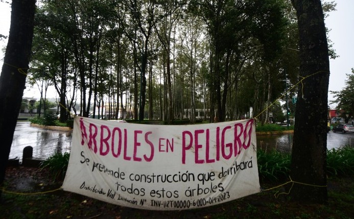Ante ello, ciudadanos colocaron lonas con mensajes como “árboles en peligro, se pretende construcción que derribará todos estos árboles”.
