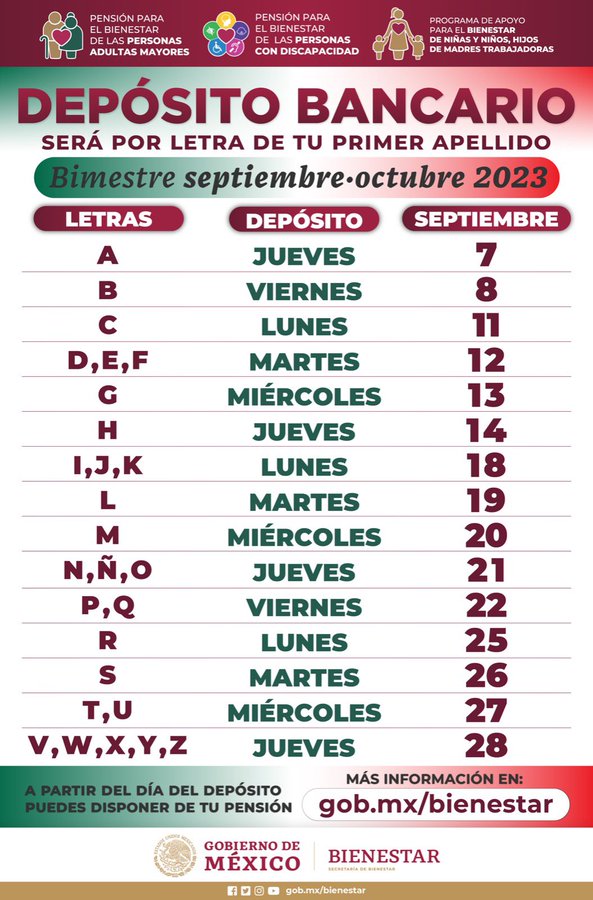 A través de su cuenta de Twitter, la titular de la dependencia, Ariadna Montiel publicó el calendario de pagos, en la que se detalla que día le toca a cada persona de acuerdo a la primera letra del apellido paterno.