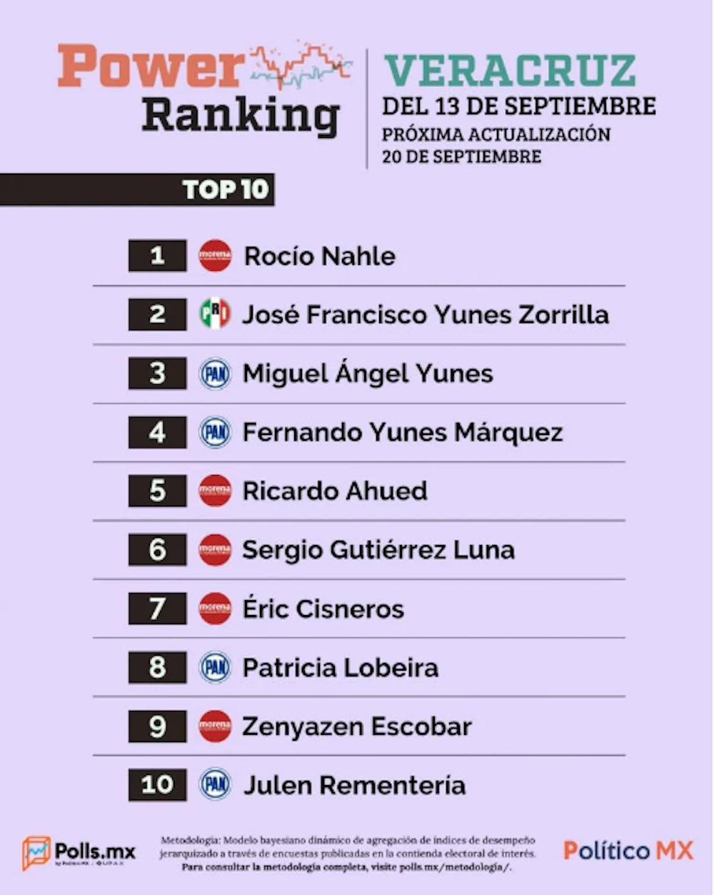 El Power Ranking de Veracruz de Polls MX, presentado semanalmente, NO es una encuesta. Es un modelo que jerarquiza la fuerza política de los aspirantes a la gubernatura en las elecciones 2024 tomando en cuenta careos públicos e hipotéticos entre rivales de diferentes partidos, así como la relevancia mediática y conversacional de las casas encuestadoras. La próxima actualización del Power Ranking de Veracruz se publicará el 20 de septiembre de 2023.