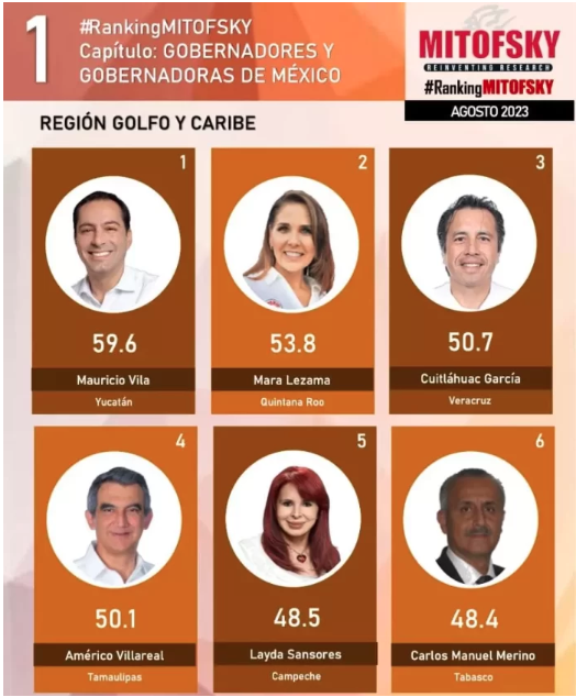 Mientras que el primero y segundo puesto son ocupados por los mandatarios Mauricio Vila, de Yucatán, con 59.6, seguido de Mara Lezama, de Quintana Roo, con 53.8, respectivamente.