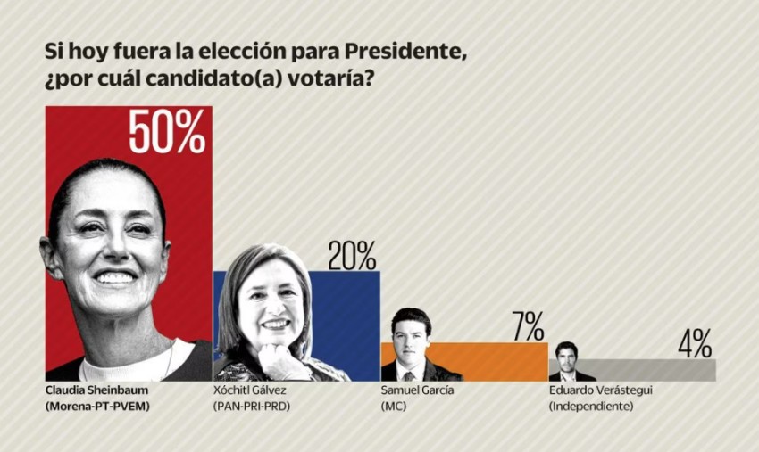 Cuando se presenta a los encuestados un simulacro de boleta electoral con nombres de candidato(a)s (también denominado “careo”), los porcentajes de intención de voto son los siguientes: Claudia Sheinbaum (Morena-PVEM-PT) 50%; Xóchitl Gálvez (PAN-PRI-PRD) 20%; Samuel García (MC) 7%; y Eduardo Verástegui, quien busca ser candidato independiente, 4%. Un 19% de los encuestados no manifestó preferencia por ningún candidato(a).