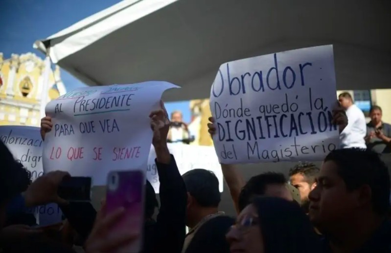 Los profesores se pararon frente al estrado instalado en la calle Enríquez donde hay autoridades del gobierno del estado para disfrutar del desfile, y ahí los manifestantes abrieron cartulinas color blancas que llevaban los letreros de “Al presidente para que vea lo que se siente”, “Obrador dónde quedó la dignificación del magisterio”, “No que no, sí que sí ya volvimos a salir”.