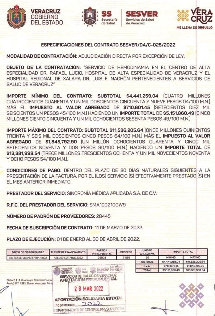 Para el 2020, el Gobierno de Veracruz, le entregó a Sincronía Médica Aplicada SA de CV un contrato por 9 millones 712 mil 777 pesos de manera directa. Y en el 2021, otro contrato por un monto de 10 millones 459 mil pesos; en 2022 el monto incrementó a más de 15 millones, con la entrega de otro contrato por 4 millones 441 mil pesos.