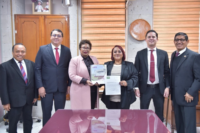 La presidenta de la Mesa Directiva de la LXVI Legislatura, diputada Adriana Esther Martínez Sánchez, recibió de la auditora general del Órgano de Fiscalización Superior del estado (Orfis), Delia González Cobos, el informe de labores 2022-2023 que incluye las actividades y principales acciones realizadas en materia de fiscalización superior del organismo autónomo.