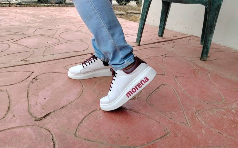 Dijo que sus zapatos deportivos que lucen el nombre de Morena con letras guinda, son cómodos y prácticos.