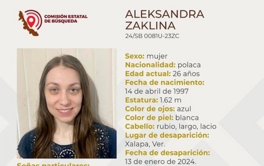 La joven de nacionalidad polaca, Aleksandra Zaklina de 26 años, desapareció el pasado sábado 13 de enero en Xalapa, la capital de Veracruz. Según la ficha de desaparición de la Comisión de Búsqueda de Veracruz.