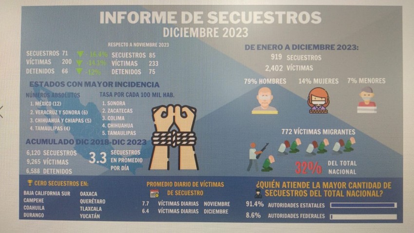 También menciona que 772 víctimas de secuestro fueron migrantes, es decir, el 32 por ciento del total nacional. De diciembre de 2018 a diciembre de 2023, se acumularon 6 mil 120 secuestros, 9 mil 265 víctimas y 6 mil 588 detenidos.