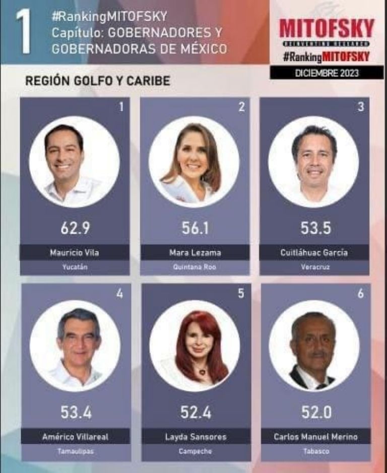En este orden, el primer lugar lo ocupa Mauricio Vila de Yucatan con 62.9 por ciento; el segundo, Mara Lezama de Quintana Roo 56.1 por ciento; tercer lugar, Cuitláhuac García Jiménez 53.5 por ciento; cuarto, Américo Villareal de Tamaulipas 53.4 por ciento; quinto, Layda Sansores de Campeche con 52.4 por ciento y en sexto, Carlos Manuel Merino en Tabasco con 52 por ciento.