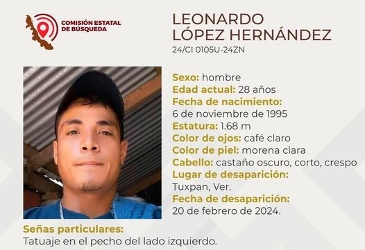 La ficha 24/CI 0105U- 24ZN reporta la desaparición de Leonardo López Hernández, de 28 años de edad, con quien se perdió el contacto el pasado 20 de febrero de 2024 en Tuxpan, Veracruz.