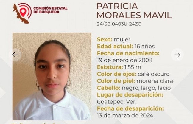 La ficha 24/SB 0403U-24ZC reporta la desaparición de Patricia Morales Mávil, de 16 años de edad, con quien se perdió el contacto el pasado 13 de marzo de 2024 en Coatepec, Veracruz.
