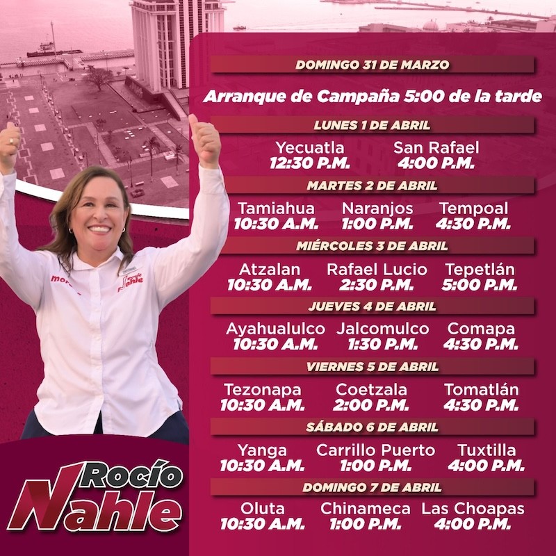 Tras su arranque de campaña este domingo, la candidata al gobierno de Veracruz por la coalición “Sigamos haciendo historia”, Rocío Nahle García, continuará su gira donde recorrerá 108 municipios de los 212 que integran el territorio estatal ya que desde el inicio de este proceso a la fecha visitó los primeros 104 municipios.