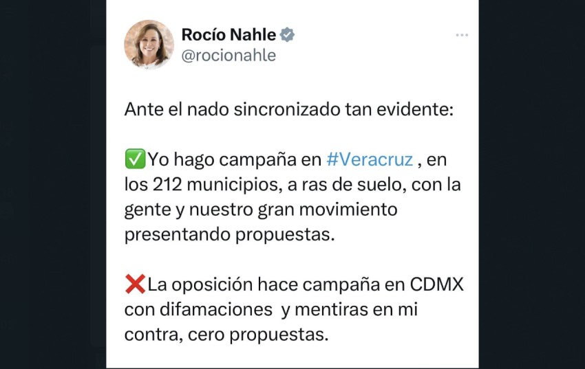 Mientras la oposición hace campaña en Ciudad de México y pretende debatir en medios de comunicación, una servidora continúa en territorio, ante la evidente estrategia llamada “nado sincronizado” para tratar de subir a su candidato prianista José Yunes Z. ante las encuestas que dan a la coalición que encabeza Morena más de 30 puntos de ventaja, afirmó la candidata a la gubernatura de Morena, PT, Partido Verde y Fuerza por México en Veracruz, Rocío Nahle García.