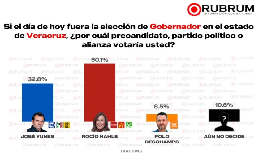 En tanto a la pregunta "Si el día de hoy fuera la elección a gobernador en el estado de Veracruz ¿por cuál candidato, partido político o alianza votaría usted? realizada por Rubrum, el 50.1% de los encuestados aseguró que votaría por Rocío Nahle, candidata de la coalición Morena-PT-PVEM.