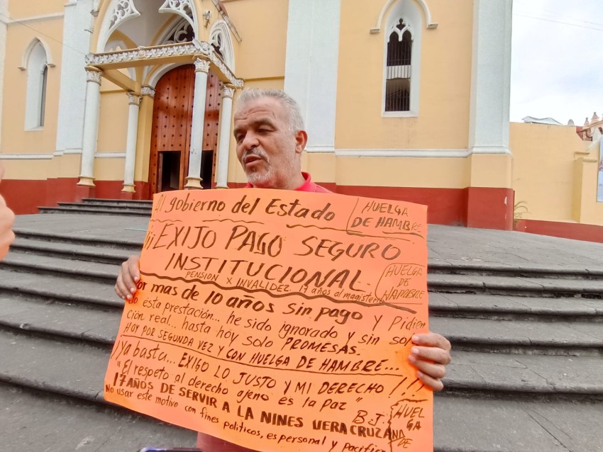 "No levantaré mi huelga de hambre hasta que la SEV me pague el finiquito de mi seguro de vida institucional, el cual no llega ni a 400 mil pesos, y refiere que no es protagonismo lo que busca, sino que su exigencia estriba porque es periodo electoral y al terminar este, se olvidaran de él y de su caso, pero sobre todo que el pago sea en una sola emisión.”