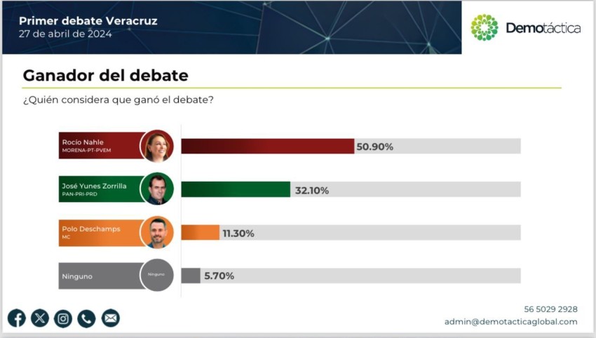 Con 50.9 por ciento de la preferencia, Rocío Nahle García ganó el primer debate de los candidatos a la gubernatura de Veracruz auspiciado por el Organismo Público Local Electoral (OPLE) de acuerdo a la encuestadora DEMOTÁCTICA.