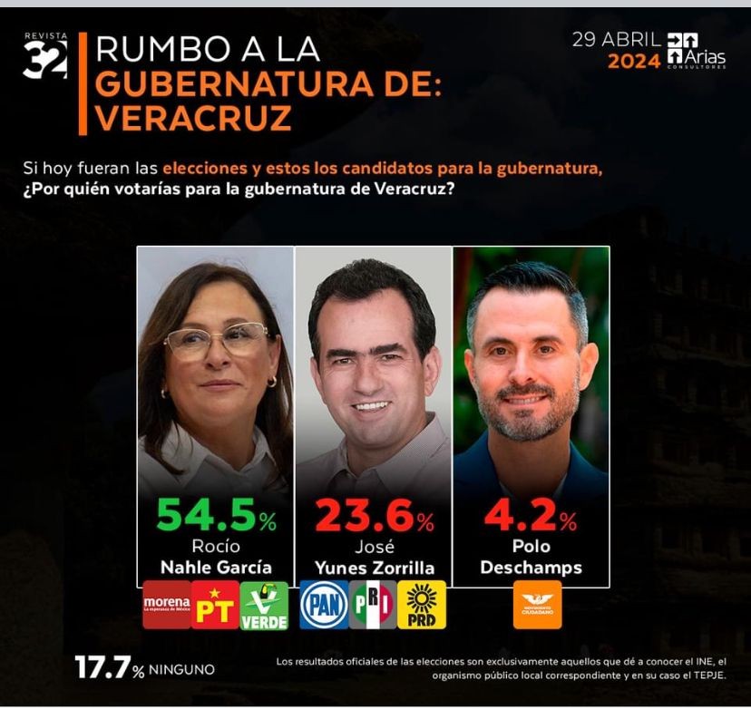 ?La medición realizada del 25 al 29 de abril por la reconocida empresa encuestadora da como virtual ganadora de la gubernatura de Veracruz a la candidata morenista, dejando muy abajo al abanderado opositor.