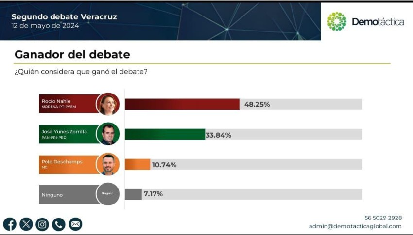 De acuerdo con la casa encuestadora Demotáctica, la candidata a la gubernatura de Veracruz por Morena, PT, PVEM y Fuerza por México, Rocío Nahle García, obtuvo un contundente triunfo en el segundo debate organizado por el OPLE, al obtener el 48.25 por ciento de la preferencia contra 33.84 por ciento del candidato opositor Pepe Yunes y 10.74 del candidato de Movimiento Ciudadano, Polo Deschamps.