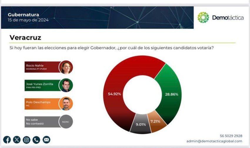 A la pregunta “Si hoy fueran las elecciones para elegir Gobernador ¿Por cuál de los siguientes candidatos votarías?” un 54.92% de lo encuestados respondió que lo haría por Rocío Nahle, mientras que 28.68% dijo que lo haría por el abanderado del PRI-PAN-PRD, José Francisco Yunes Zorrilla.