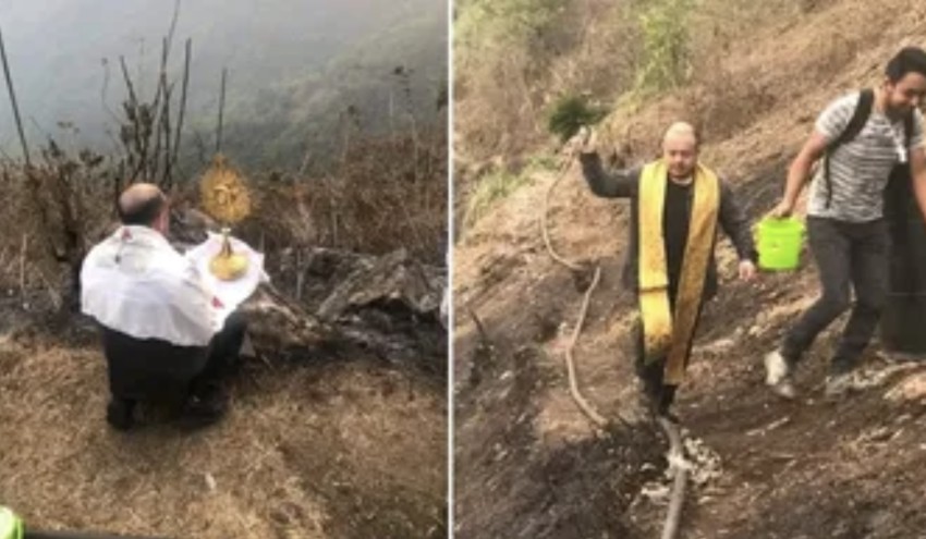 El sacerdote, con el Santísimo Sacramento en las manos, ofició una misa y regó agua bendita en las montañas para que termine el estiaje y los incendios logren ser sofocados.