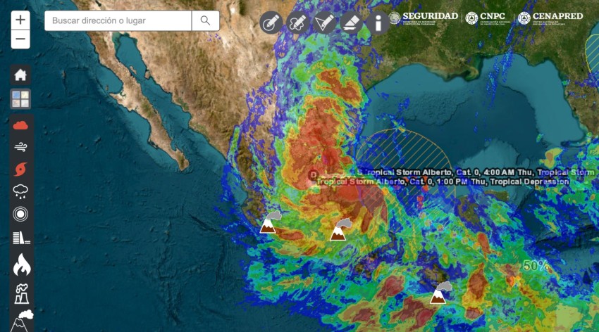 La Coordinación Nacional de Protección Civil actualiza el Boletín SIAT-CT para la Tormenta Tropical Alberto, manteniendo Alerta Naranja (Peligro Alto) por Ciclón Acercándose para el norte de Veracruz, pero cambiando las alertas Amarilla y Verde al modo Ciclón Alejándose para el centro y sur del estado, respectivamente. Este cambio significa mantener la vigilancia ante las lluvias y vientos asociados al desplazamiento de la tormenta.