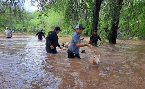 La Guardia Estatal informó que brindó apoyo a los lugareños del ejido Miraflores, municipio de Güémez, tras el desbordamiento del río Corona. En el lugar fueron rescatadas dos personas y siete borregos.