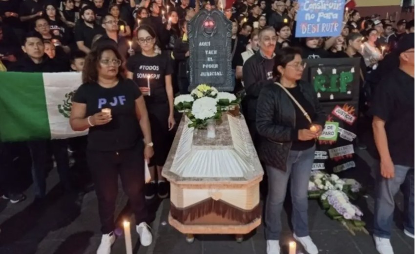 Con un ataúd vacío, una cruz con flores blancas, veladoras encendidas y una lápida que lleva el mensaje de “Aquí yace el Poder Judicial”, se manifestaron empleados y empleadas de juzgados federales en la plaza Sebastián Lerdo para protestar ante el avance de la iniciativa de Reforma al Poder Judicial en la Cámara de Diputados.