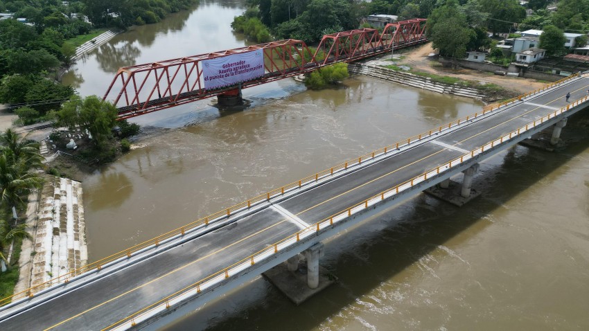 Se trata de una estructura de 120 metros de longitud sobre el río Tesechoacán y paralela al paso ferroviario, 330 metros de accesos en concreto hidráulico, señalización horizontal y barandales, donde la inversión rondó los 100 millones de pesos del Fondo de Aportaciones para el Fortalecimiento de las Entidades Federativas, que impacta de manera directa a 6 mil 800 habitantes.