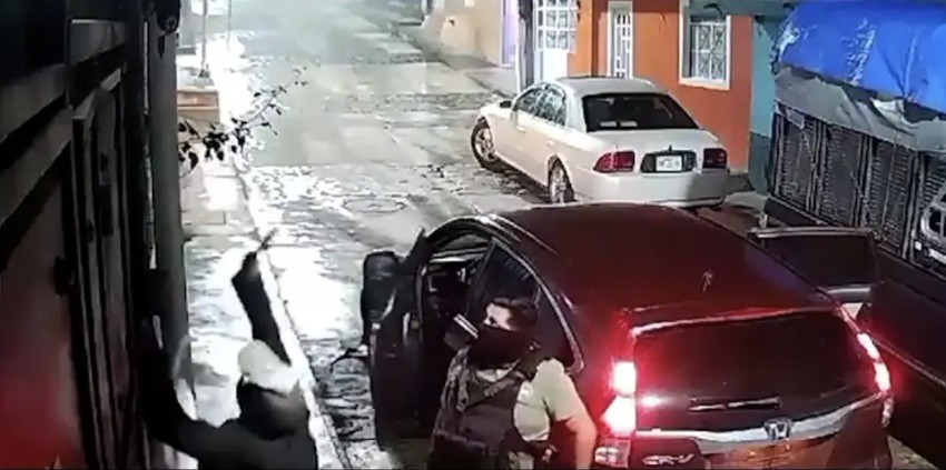 En la grabación de una cámara de seguridad todo quedó registrado; se puede observar a al menos cinco hombres portando armas largas e intentando forzar la puerta del domicilio de la colonia Centro.