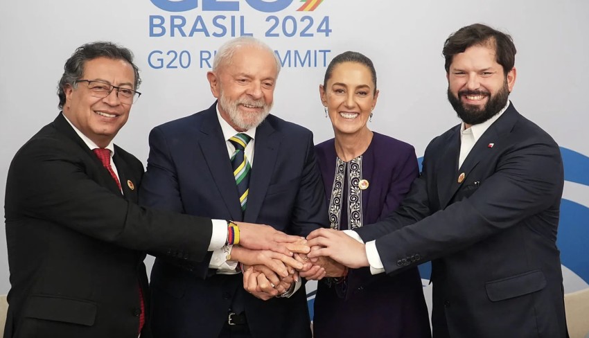 Asimismo, Sheinbaum compartió una foto con los jefes de Estado de Brasil, Luiz Inácio Lula da Silva, también anfitrión del G20; de Chile, Gabriel Boric Font; y de Colombia, Gustavo Petro; en la que resaltó la unión de Latinoamérica, en los liderazgos de izquierda y la ausencia del derechista, Javier Milei.
