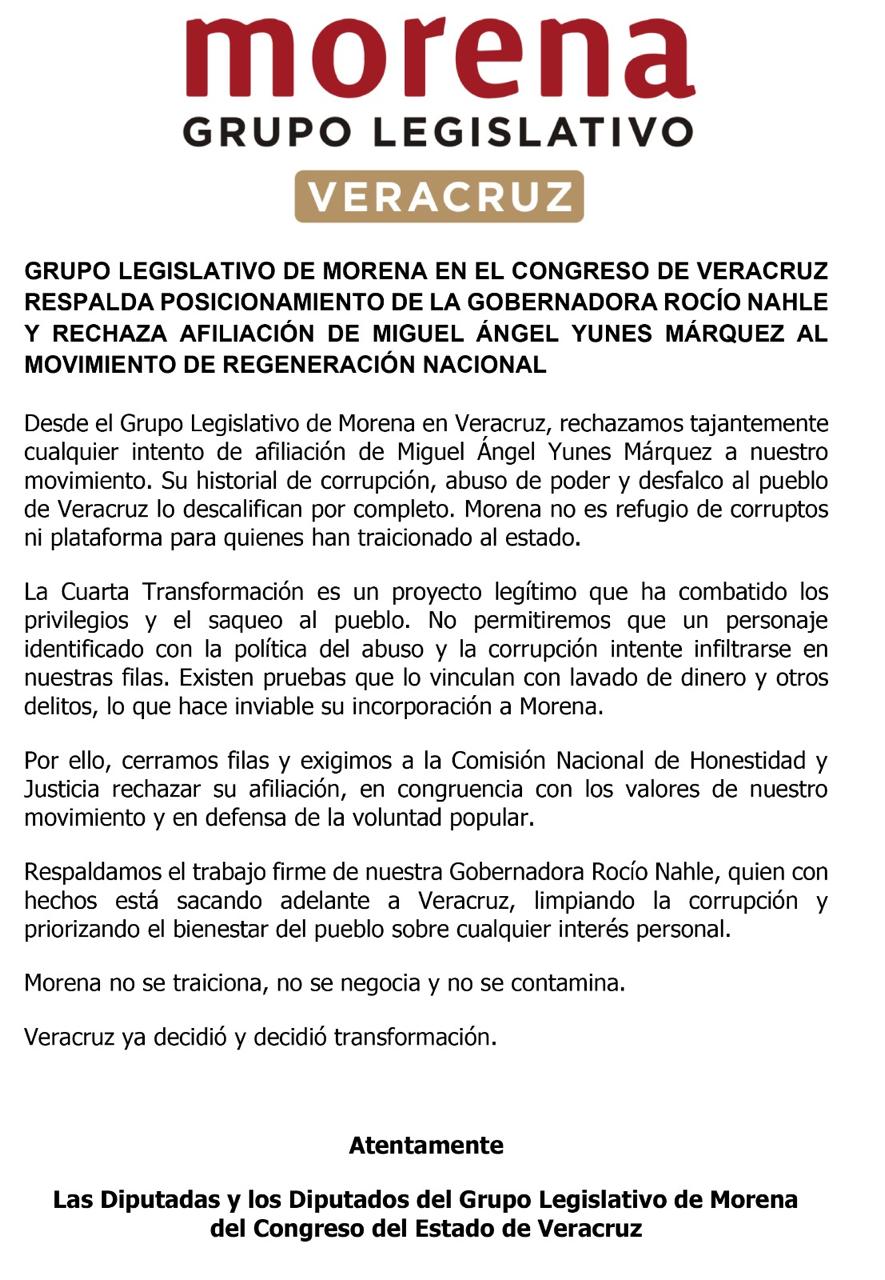 El Grupo Legislativo de Morena en el Congreso de Veracruz respalda posicionamiento de la gobernadora Rocío Nahle y rechaza afiliación de Miguel Ángel Yunes Márquez al Movimiento de Regeneración Nacional.