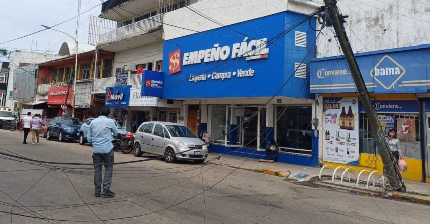 Un poste de madera de Teléfonos de México (TELMEX) se encuentra en peligro de colapso en la avenida Miguel Hidalgo, en el Centro de Minatitlán, lo que ha generado un riesgo importante para habitantes que transitan por este lugar.