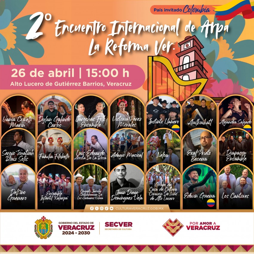 La Secretaría de Cultura de Veracruz (SECVER) invita al 2º Encuentro Internacional de Arpa, que se llevará a cabo el 26 de abril a las 15:00 horas en la localidad de La Reforma del municipio de Alto Lucero.