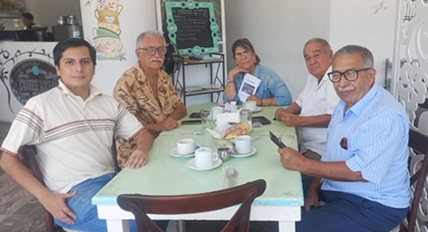 Que será presentado el próximo viernes 2 de mayo del presente año, a las 18:30 horas, en la Casa de Cultura de Minatitlán, Ver., sita en la calle Tlaxcala casi esquina con Justo Sierra, de la colonia Miguel Alemán Valdés, el director de la misma, Ing. Artemio López Cisneros, al lado del autor. La anfitriona de la reunión, Roxana Galia Reyna, administradora de Coffe Break, el C. P. Renato Palemón Vázquez Chagoya y en primer plano, a la derecha, el ingeniero Ramón Treviño Santoyo.