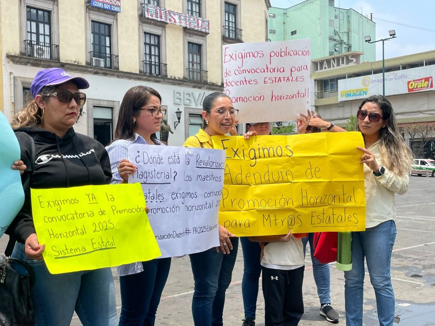 Profesores de nivel preescolar, primaria y secundaria, de sostenimiento estatal se manifestaron en plaza Lerdo, para demandar a la Secretaría de Educación de Veracruz, publique convocatoria para el sistema estatal y poder participar, de la promoción vertical que buscan maestros para tener un incentivo económico en su función docente.