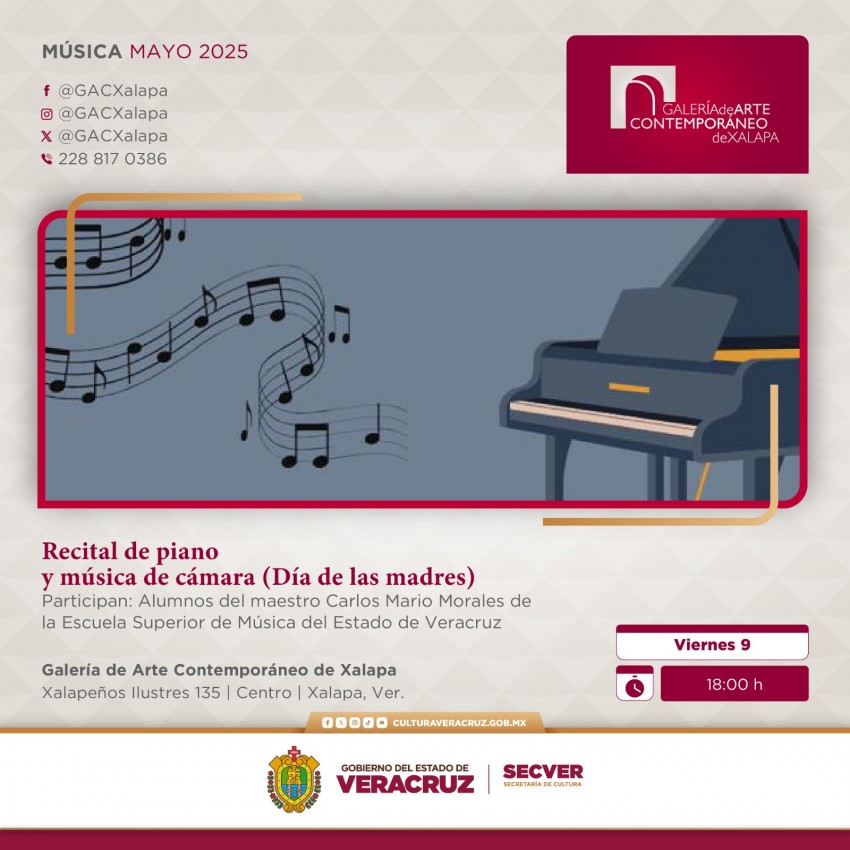 La Secretaría de Cultura de Veracruz (SECVER) invita a los recitales de este viernes en el Museo de Arte del Estado de Veracruz (MAEV), y en la Galería de Arte Contemporáneo de Xalapa (GACX), con motivo del Día de las Madres. La entrada es gratuita.
