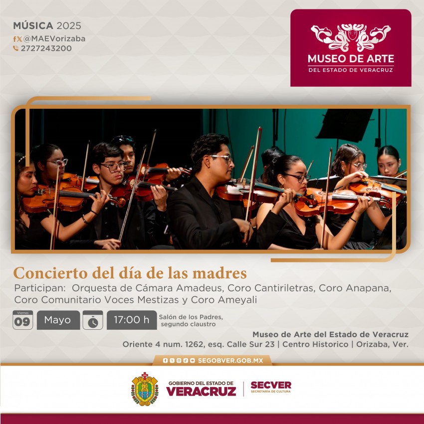 En el MAEV, a las 17:00 horas, el Coro Anapana del recinto, el Coro Ameyali, de Tecamalucan, y los coros de Córdoba, Cantiriletras y Comunitario Voces Mestizas, se unen bajo la batuta del director de orquesta Daniel García, en un programa dedicado a las madres veracruzanas.