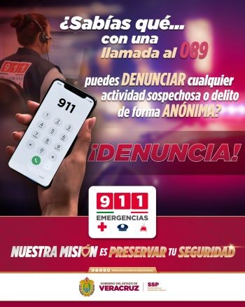 El Gobierno de Veracruz pide a la población reportar cualquier actividad delictiva a través de las líneas telefónicas 911 y 089, y hacer uso responsable de estos servicios ya que participar hace la diferencia en la construcción de comunidades más seguras y libres de violencia.