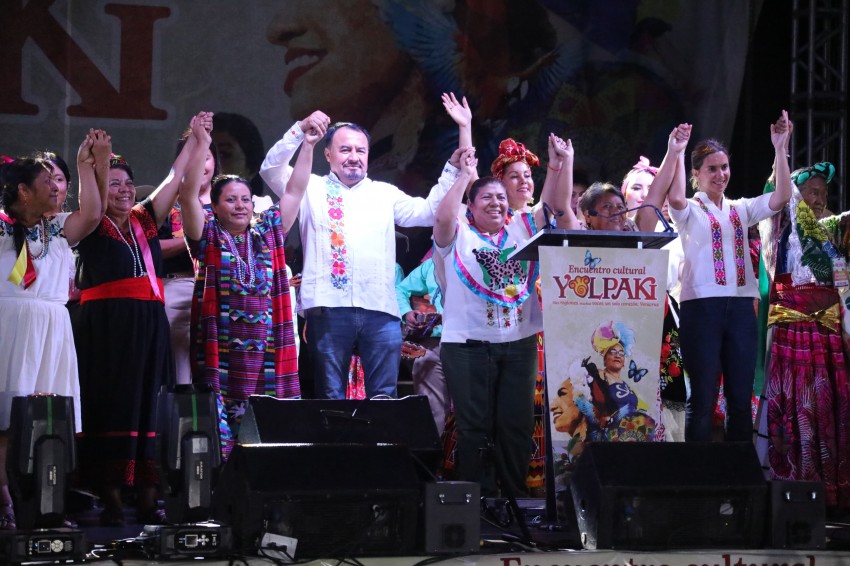 Acompañada por 20 mujeres representantes de los pueblos originarios, la secretaria de Cultura, Xóchitl Molina González, y el subsecretario de Turismo, Jorge Flores Lara, clausuró el primer Encuentro Cultural Yolpaki, corazón alegre, que reunió a más de 50 mil personas durante tres días de actividades.