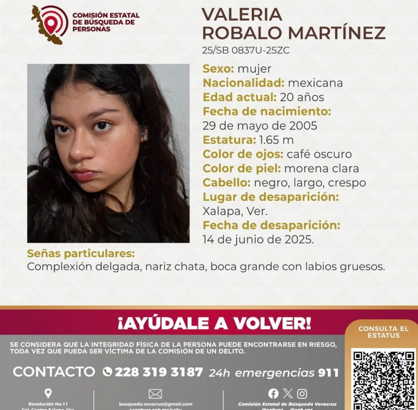 La Universidad Veracruzana (UV) y la Comisión Estatal de Búsqueda de Personas (CEBV) hicieron un llamado urgente para localizar a Valeria Robalo Martínez, estudiante de la Licenciatura en Educación Musical, reportada como desaparecida desde el sábado 14 de junio en Xalapa. Según la ficha de búsqueda emitida por la Comisión Estatal de búsqueda de Veracruz, Valeria tiene 20 años y cursa el cuarto semestre en la Facultad de Música de la UV.