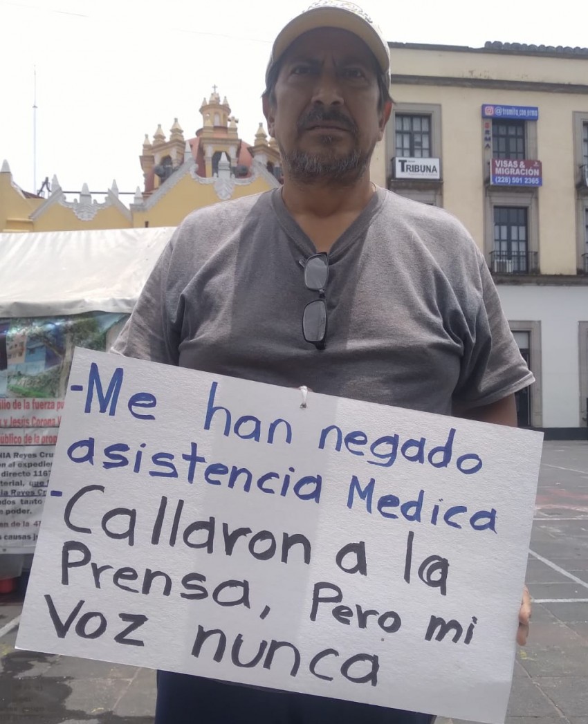 Con el rostro demacrado y ojos tristes luego de 24 días en huelga de hambre en Plaza Lerdo, el señor Juan Ricardo Ordoñez, pide justicia a gobernadora Rocío Nahle García, víctima de un fraude en la compra de 2 terrenos en la ciudad de Coatzacoalcos.