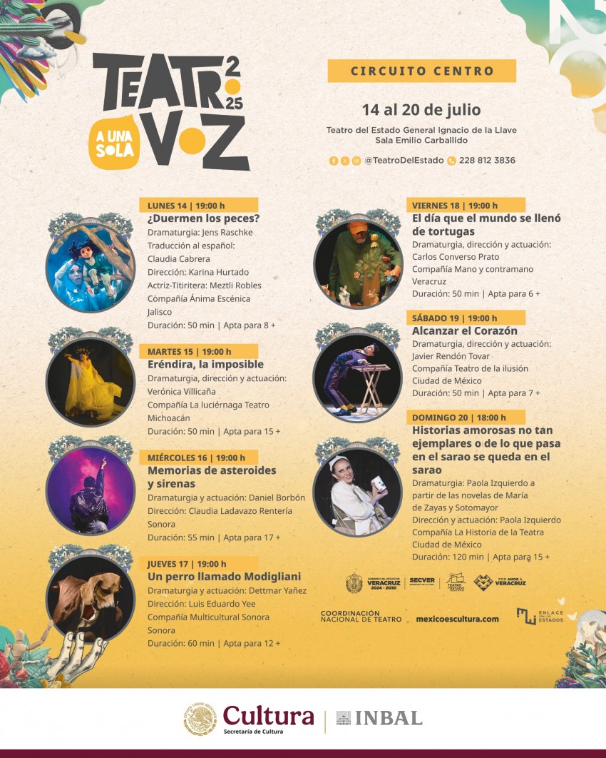 La Secretaría de Cultura de Veracruz (SECVER) y la Coordinación Nacional de Teatro del INBAL presentan la programación de la vigésima edición del Festival de Monólogos Teatro a Una Sola Voz, que se llevará a cabo del lunes 14 al domingo 20 de julio en la Sala Emilio Carballido del Teatro del Estado General Ignacio de la Llave. La entrada será gratuita con boleto de control.
