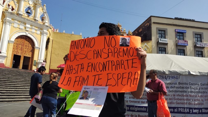 Familiares y amigos de Antonio Aldazaba Sánchez se manifestaron este lunes frente al Palacio de Gobierno para exigir que autoridades den con su paradero. Desapareció el pasado viernes 11 de julio cuando se dirigía a una entrevista de trabajo en el centro de Xalapa.