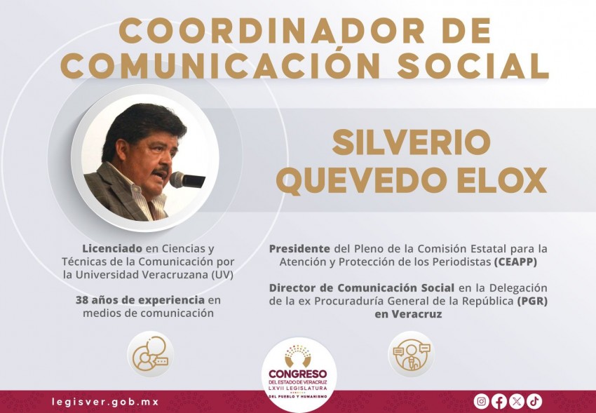 El presidente de la Junta de Coordinación Política (Jucopo), del congreso local de Veracruz, diputado Esteban Bautista Hernández, entregó al comunicador Silverio Quevedo Elox el nombramiento que lo acredita como titular de la Coordinación de Comunicación Social del Congreso del Estado de Veracruz. En un acto realizado en las oficinas de la Jucopo, el legislador morenista destacó la importancia de la labor de comunicar a la sociedad veracruzana, con responsabilidad, profesionalismo, oportunidad, claridad, veracidad y eficiencia, sobre el trabajo que realizan las diputadas y los diputados como representantes populares y garantes del diálogo constructivo en Veracruz. Bautista Hernández, indicó que esta encomienda emana del compromiso que este Congreso mantiene con la población, “a la cual nos debemos y a quienes tenemos la obligación de atender e informar”. Enfatizó que en esta labor debe prevalecer el respeto y sujeción a la Ley, la apertura y el respeto a las diversas posturas políticas representadas en esta Soberanía, dentro del marco de la pluralidad y la libertad de expresión. Formación y trayectoria Silverio Quevedo Elox es licenciado en Ciencias y Técnicas de la Comunicación por la Universidad Veracruzana (UV). Tiene 38 años de experiencia en medios de comunicación. Inició en Editora la Voz del Istmo y en estaciones radiofónicas. En el servicio público, se desempeñó como presidente del Pleno de la Comisión Estatal para la Atención y Protección de los Periodistas (CEAPP) y director de Comunicación Social en la Delegación de la entonces Procuraduría General de la República, (PGR) en Veracruz. dame titulo, subtitulo y palabras claves