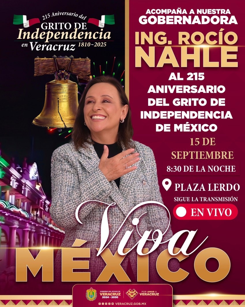 La titular del Ejecutivo, Rocío Nahle García, destacó el orgullo y la responsabilidad de dar voz al pueblo veracruzano en esta fecha patria, reafirmando el compromiso de su administración con la paz, la seguridad y la celebración de la mexicanidad.