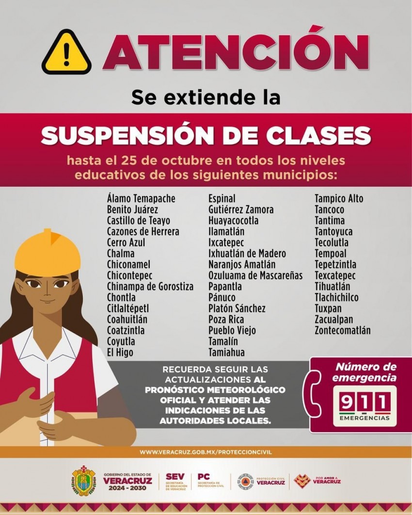 Por los trabajos de recuperación en la zona norte, el Comité Estatal de Emergencias, en coordinación con la Secretaría de Educación de Veracruz, informa que se extiende la suspension de clases y actividades escolares en 43 municipios hasta el sábado 25 de octubre: