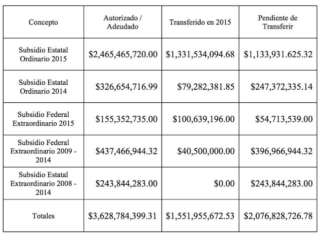 De los subsidios Federales extraordinarios autorizados en 2015, por $155,352,735.00 fueron radicados a la SEFIPLAN $54,713,539.00 y directamente en la Universidad $100,639,196.00, quedando pendiente de transferir a esta Institución la totalidad de lo recibido por la SEFIPLAN. Del monto pendiente de ministrar al inicio del año 2015, por concepto de subsidio extraordinario Federal, proveniente de los ejercicios 2009 a 2014 por $437,466,944.32, la Universidad recibió recursos por $40,500,000.00, quedando pendiente la cantidad de $396,966,944.32.