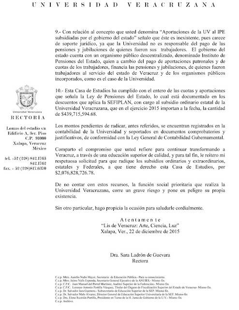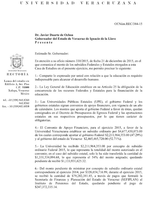 Comparto el compromiso que usted refiere para continuar transformando a Veracruz, a través de una educación superior de calidad, y para tal fin, le reitero mi respetuosa solicitud para que radique los subsidios ordinarios y extraordinarios, estatales y Federales, a que tiene derecho esta Casa de Estudios, por $2,076,828,726.78.