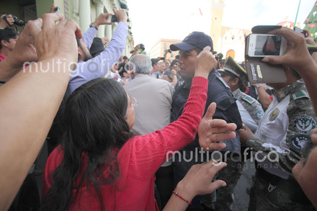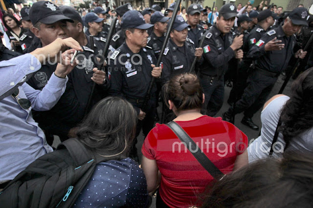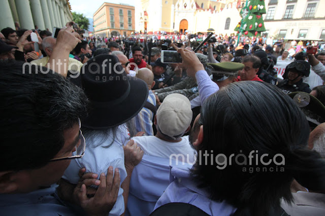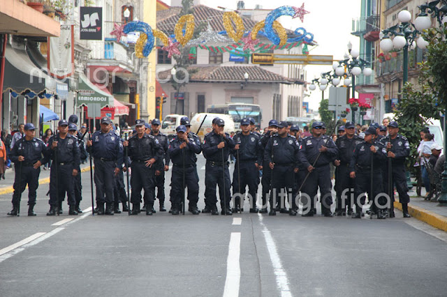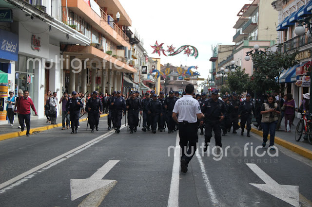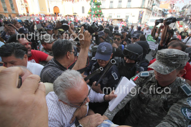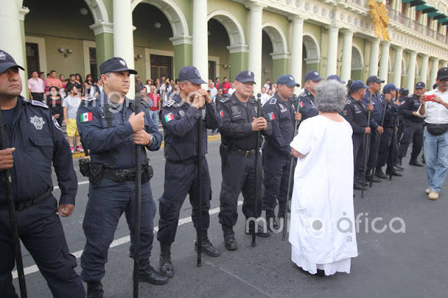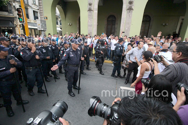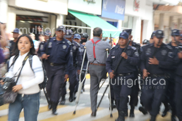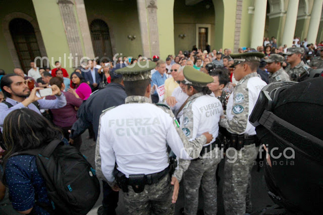 Cerca de 30 elementos de seguridad pública con macanas y algunos con armas de fuego y cascos realizan el operativo, donde desalojaron a los pensionados que exigen la mensualidad de diciembre y aguinaldos que no ha depositado el Gobierno del Estado.