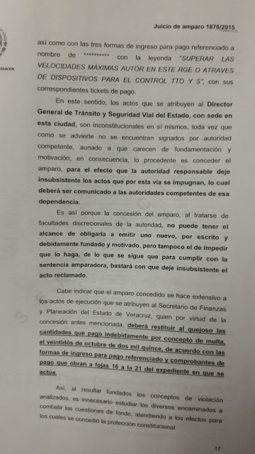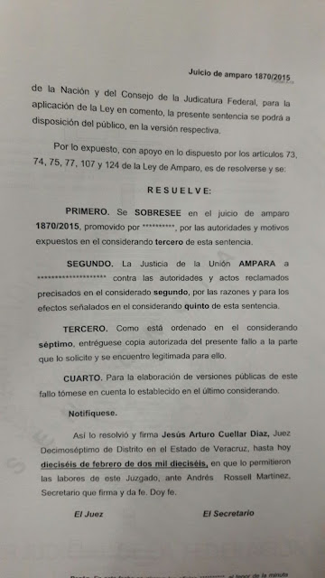 Por lo anterior, se resolvió el Juicio de Amparo 1870/2015, firmado por Jesús Arturo Cuellar Díaz, Juez Decimoséptimo de Distrito en el Estado de Veracruz, con fecha del 16 de febrero de 2016, en el sentido de que “la Justicia de la Unión AMPARA contra las autoridades y actos reclamados”.